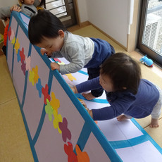 今日はたんぽぽ組のお部屋に大きな段ボールのトンネルが出現!